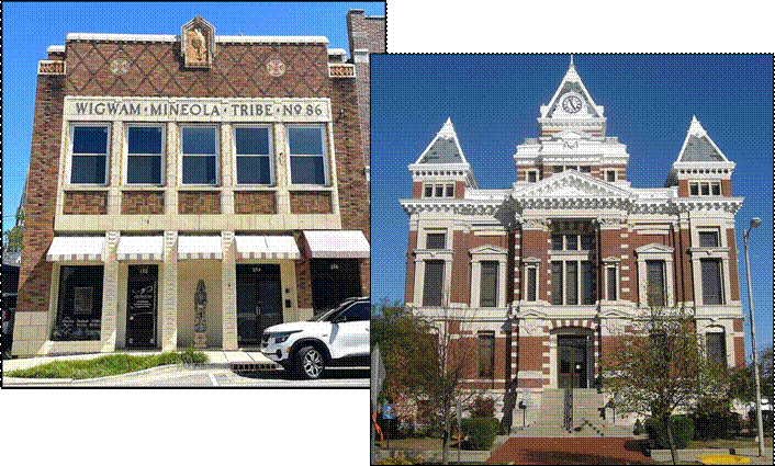 County Courthouse (1879-1881), recognized for its historical significance. Among other noteworthy structures are the Herriott-Clarke Building, established in 1853, the former City Hall and Opera House, dating back to 1895, the Artcraft Theater, built in 1924, and the Wigwam Mineola Tribe Building, constructed around 1915. (Photographs shown here of the Franklin County Courthouse and the Wigwam Mineola Tribe building are from Wikipedia.)